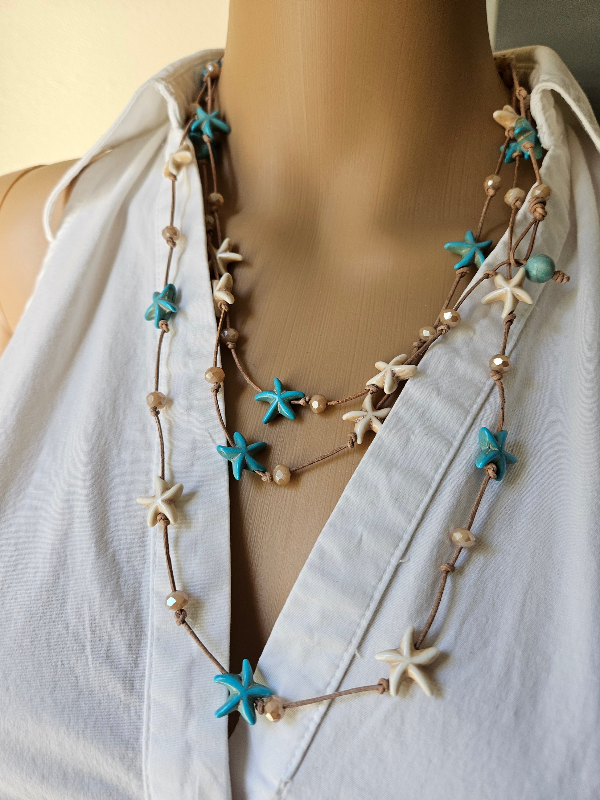 Leather Starfish Wrap Necklace: Cream & Turquoise color Beaded Jewelry